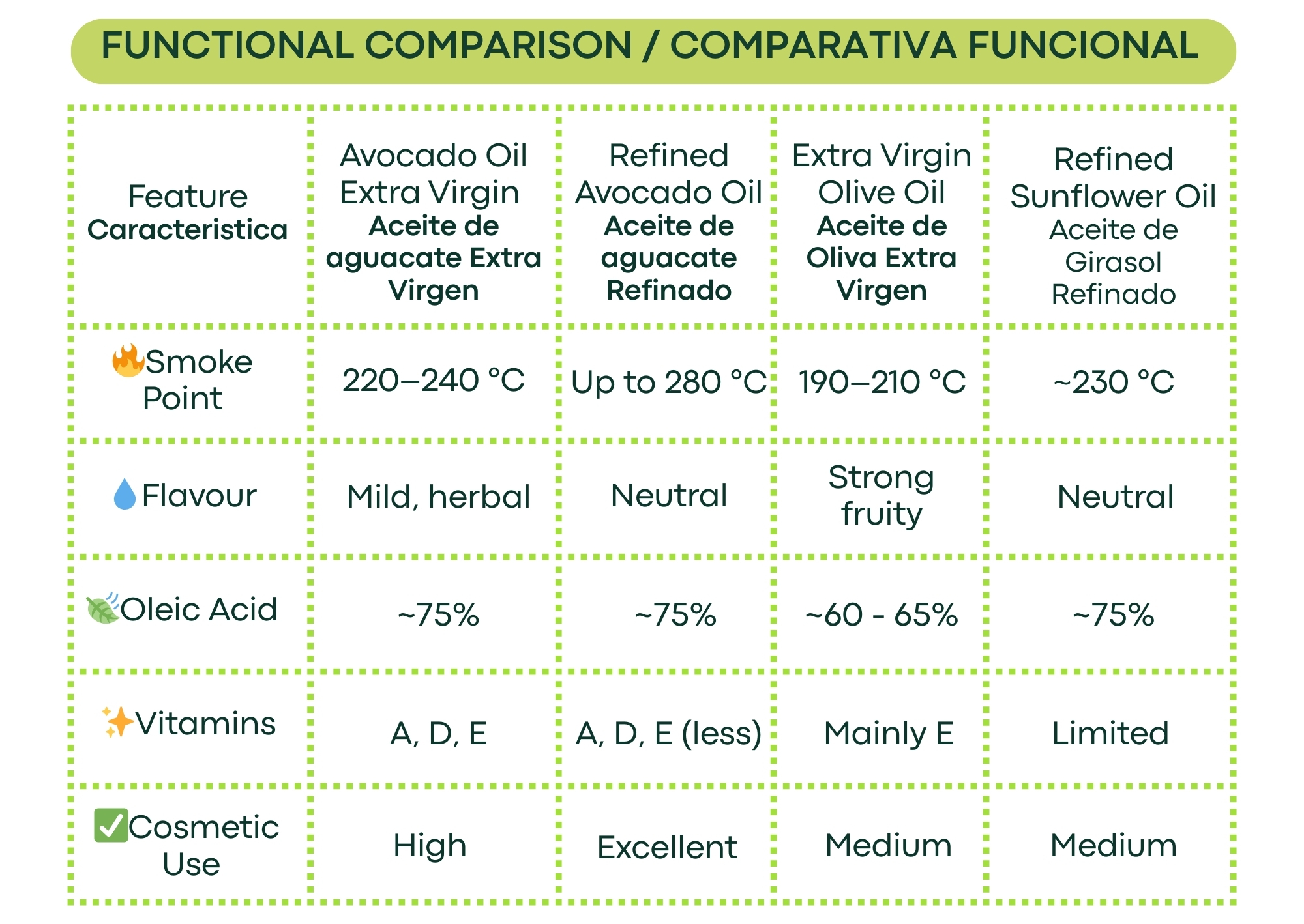 Es un aceite vegetal de alto valor obtenido de la pulpa del aguacate, no de la semilla. Esto garantiza una riqueza natural en ácidos grasos monoinsaturados (principalmente ácido oleico), vitamina E y antioxidantes vegetales que favorecen la salud cardiovascular, cutánea y cerebral.